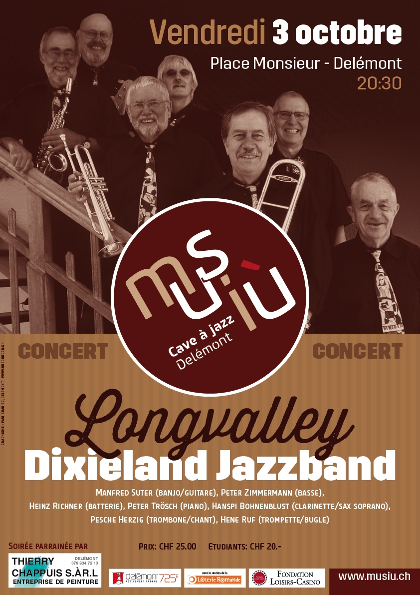 Bien connu du public delémontain, puisqu’il participa déjà dans les années 70 à plusieurs festivals de jazz à la salle Saint-Georges, le Longvalley Dixieland Jazzband s’est également produit sous les voûtes séculaires du Jazz-Club de Delémont à nombreuses reprises. C’est avec plaisir que la Cave à Jazz Musiù les recevra le vendredi 3 octobre dès 20h30. Une excellente soirée en perspective!