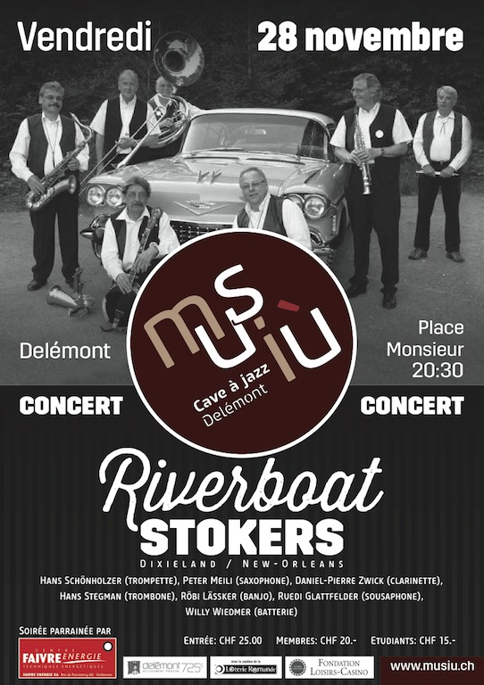 Pour son dernier concert de l’année 2014, la cave à jazz Musiù recevra une superbe formation Dixieland, les «RIVERBOAT STOKERS». Ces musiciens chevronnés viennent de la région zurichoise et fêtent cette année leurs 40 ans d’existence.