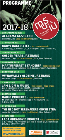 Le comité de la cave à jazz Musiù est heureux de vous présenter le programme de la nouvelle saison 2017/2018. Nous avons maintenu l’alternance entre le jazz traditionnel et le jazz moderne et sommes persuadés que vous aurez un immense plaisir à venir découvrir ce superbe programme.