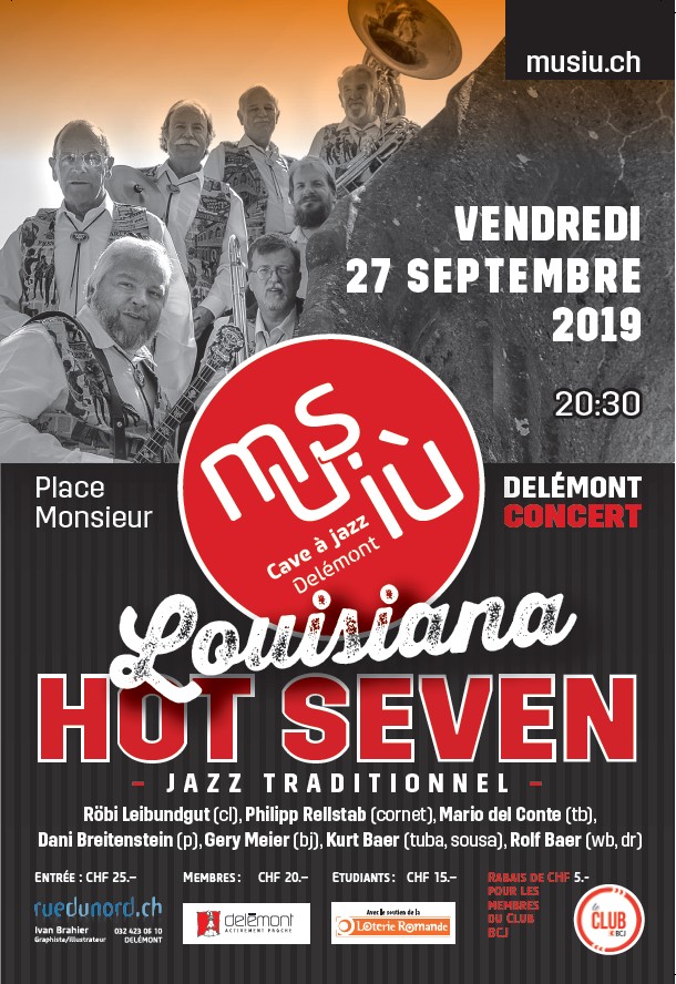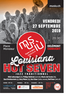 Pour le premier concert de de la saison 2019/20, nous avons la chance de pouvoir vous offrir la crème de la crème du jazz traditionnel en Suisse, le Louisiana Hot Seven, ou LH7. C’est un groupe basé à Zürich dont la réputation dépasse largement les frontière de notre pays. On les a vus jouer entre autres à Giverola, en Espagne, la Mecque des fans du style Nouvelle Orléans, qui n’invite que les meilleurs. Le centre d’activité du LH7, toutefois, est en Suisse, où ils ont joué pratiquement sur toutes les scènes importantes, que ce soit aux festivals tels que La Lenk, Le Landeron, Bâle, Sargans, Lucerne, ou dans des clubs, en particulier aussi à Delémont en 2009.