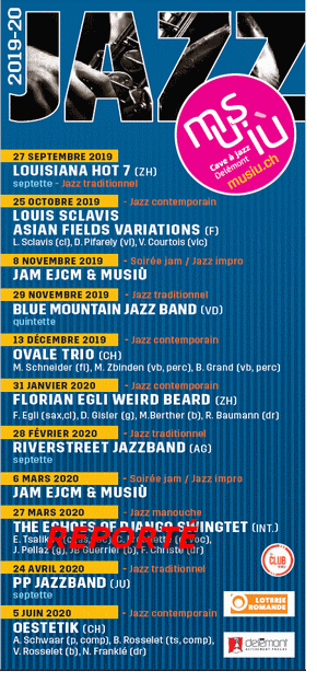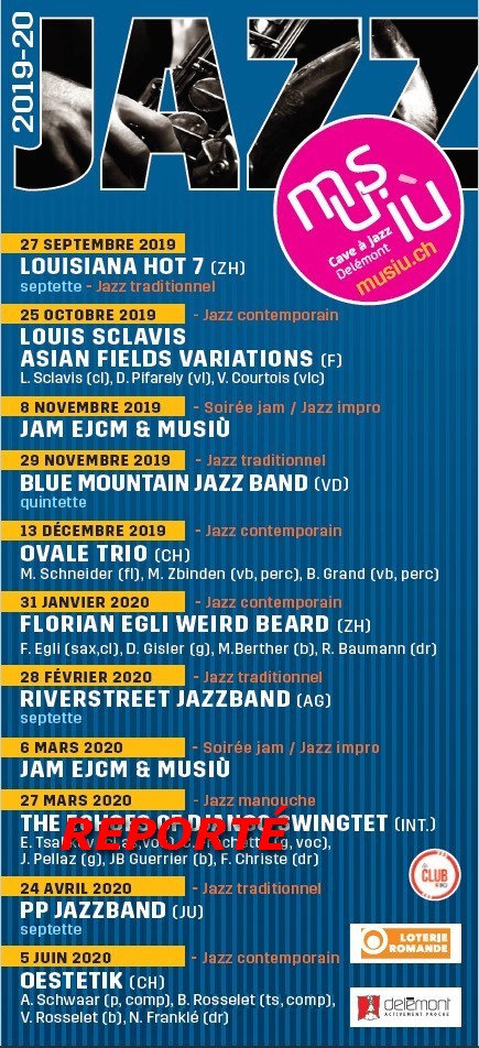 Le comité de la cave à jazz Musiù est heureux de vous présenter le programme de la nouvelle saison 2019/2020. Nous avons maintenu l’alternance entre le jazz traditionnel et le jazz moderne et sommes persuadés que vous aurez un immense plaisir à venir découvrir ce superbe programme.