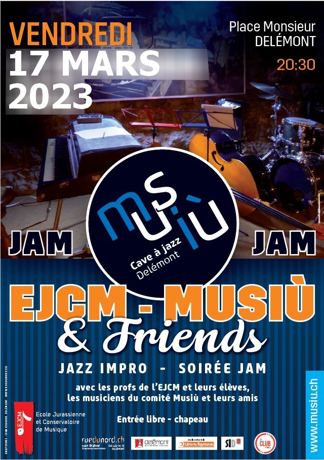 Musiù s’allie une nouvelle fois à l’École Jurassienne et Conservatoire de Musique (EJCM) pour vous inviter à participer à une soirée jam exceptionnelle, comme toujours. Celle-ci sera animée par les musiciens du comité de MUSIÙ, leurs amis ainsi que les professeurs de l’EJCM et leurs élèves ou tout autre musicien intéressé et compétent.